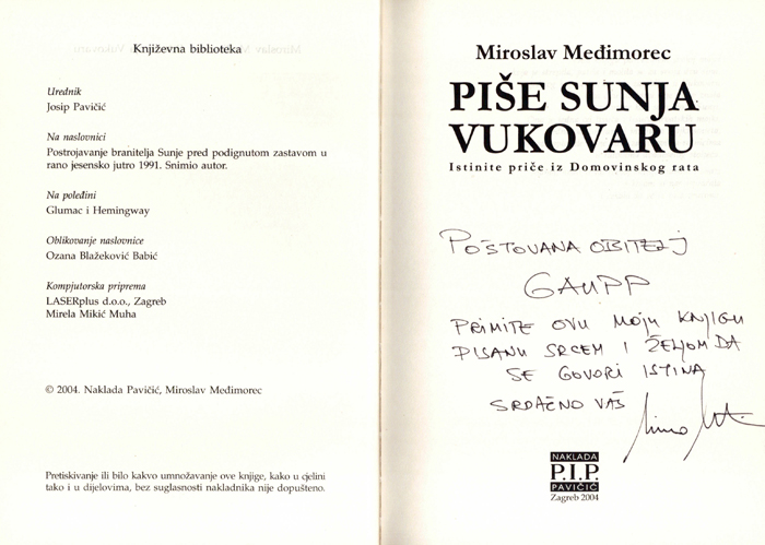 Ovu knjigu posvećujem svojoj majci koja je strepila, patila i molila se za svoja dva sina, jednog koji se borio i bio zarobljen u Vukovaru i za čiju sudbinu nije dugo znala i za mene koji sam bio u Sunji. Ona je jedna od tisuća i tisuća hrvatskih majki, jedna od milijuna i milijuna majki svijeta, koje su isplakale svoje suze za sinovima-ratnicima u ratovima dvadesetog stoljeća.