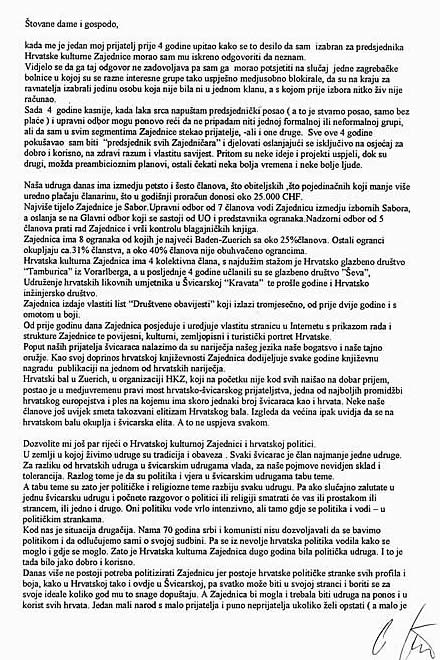 Danas više ne postoji potreba politizirati Zajednicu, jer postoje hrvatske političke stranke svih profila i boja, kako u Hrvatskoj tako i ovdje u Švicarskoj, pa svatko može biti u svojoj stranci i boriti se za svoje ideale koliko god mu to snage dopuštaju. A Zajednica bi mogla i trebala biti udruga na ponos i u korist svih Hrvata. Jedan mali narod s malo prijatelja i puno neprijatelja ukoliko želi opstati (a malo je trebalo pa da nas ne bude) mora znati i moći prestati raditi u korist vlastite štete, a na radost svojih protivnika.