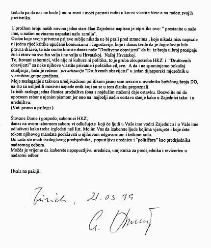 Osobe koje svoje privatno prljavo rublje nikada ne bi prali pred strancima, koje nikada nisu napisale nijednu riječ kritike upućene komunizmu i Jugoslaviji, koje i danas tvrde da je Jugoslavija bila pravna država, te iste osobe koriste danas naše “Društvene obavijesti” da bi iz broja u broj prosipaju žuć i otrov na sve što valja i ne valja u Hrvatskoj. Našoj Hrvatskoj.