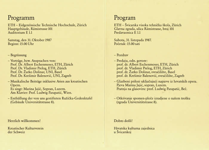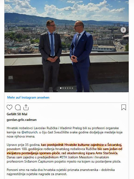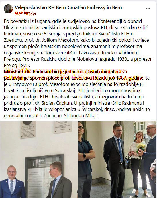 "Kao predsjednik Hrvatske kulturne zajednice u Å vicarskoj povodom 100. godiÅ¡njice roÄ‘enja nobelovca Ružićke bio sam jedan od inicijatora postavljanja spomen ploÄe...."