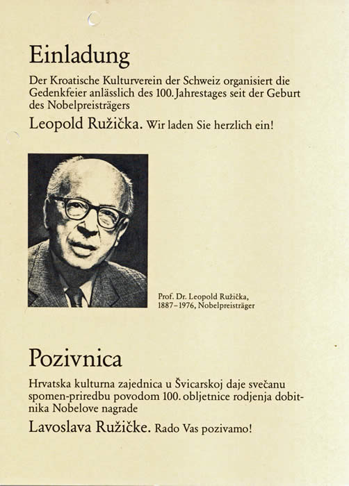 "... U ime HKZ-e dužnnost mi je obavijestiti vas o upravo dovrÅ¡enom osnutku naÅ¡eg Odbora za proslavu 100. obljetnice roÄ‘enja Lavoslava RužiÄke. Na sjednicama Glavnog odbora HKZ-e dne. 7. i 12. o.mj. dovrÅ¡eno je predlaganje i izbor kandidata. Popis sivh Älanova s adresama prilažem ovome pismu.
