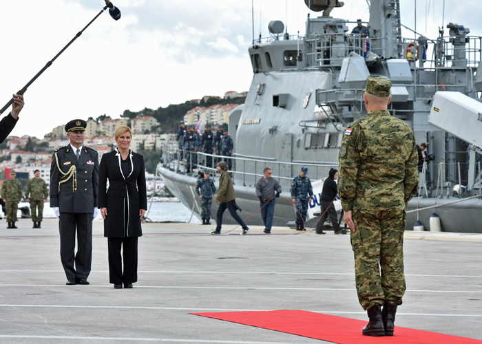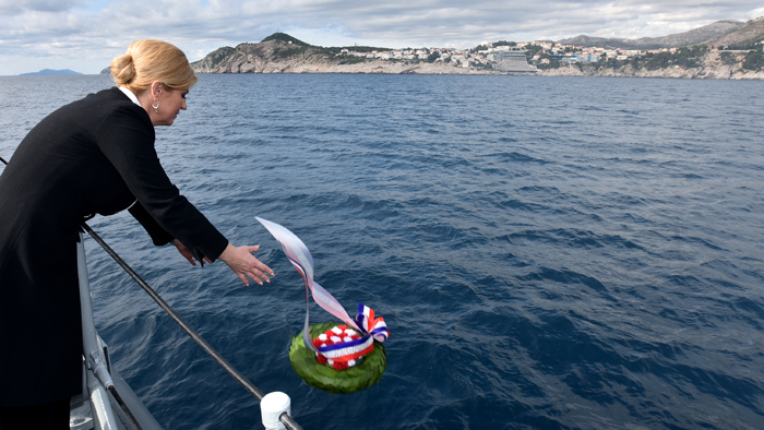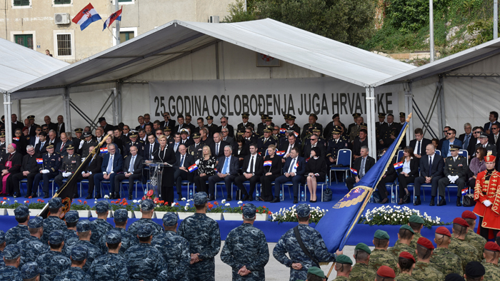 Predsjednica, koja je u grušku luku stigla raketnom topovnjačom „Dubrovnik“ u pratnji ostalih visokih dužnosnika, pozvala je nazočne da velikim pljeskom odaju počast prvom hrvatskom predsjedniku dr. Franju Tuđmanu, ratnom ministru obrane Gojku Šušku i zapovjedniku južnog bojišta generalu Janku Bobetku, kao i zapovjedniku obrane Dubrovnika Nojku Marinoviću te svim znanim i neznanim junacima hrvatskog juga.