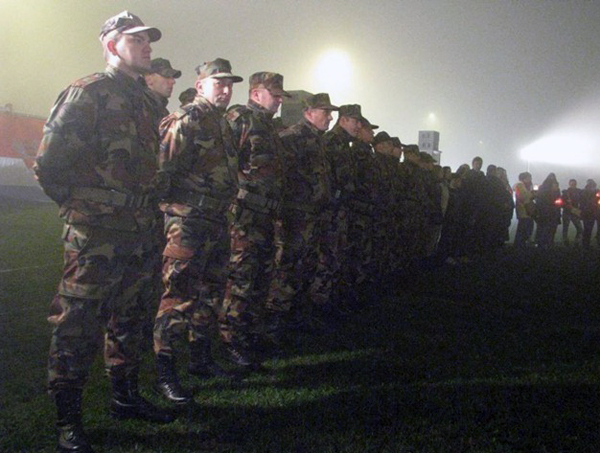 organizacijom. U magli su postrojeni hrvatski vojnici,
