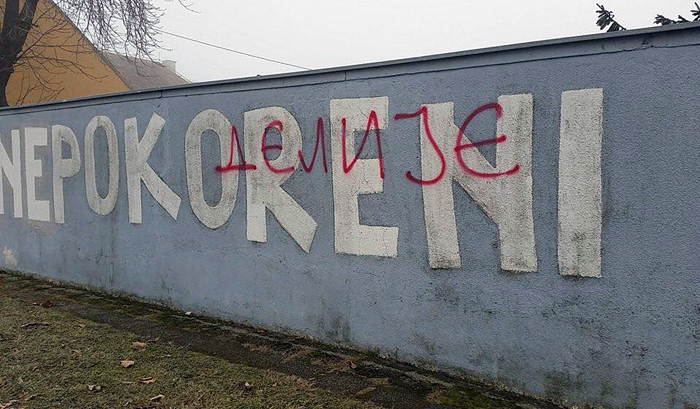 U meÄ‘uvremenu, "Delije" su iÅ¡arali i legendarni grafit "OSIJEK - NEPOKORENI GRAD" - opet agresorskom ćirilicom... Policija ni njih nije pronaÅ¡la, kao ni zloÄinca koji je u Vukovaru oskrnavio spomenik HOS-ovcu Velimiru Äereku, a milicijski sin koji je na glavi Jean Michel Nicoliera crvenom bojom oznaÄio mjesto na kojem je dobio ÄetniÄki metak, proÅ¡ao je, navodno, tek sa prekrÅ¡ajnom prijavom... Dvije godine stariji klinac iz Vukovara zaradio je kaznenu prijavu, a naljepnice koje je navodno lijepio, u vodećim medijima uvećane su kao da je rijeÄ o jumbo-plakatima, a ne svinjariji od tek 3-4 centimetra, Äiji su sadržaj svi osudili.