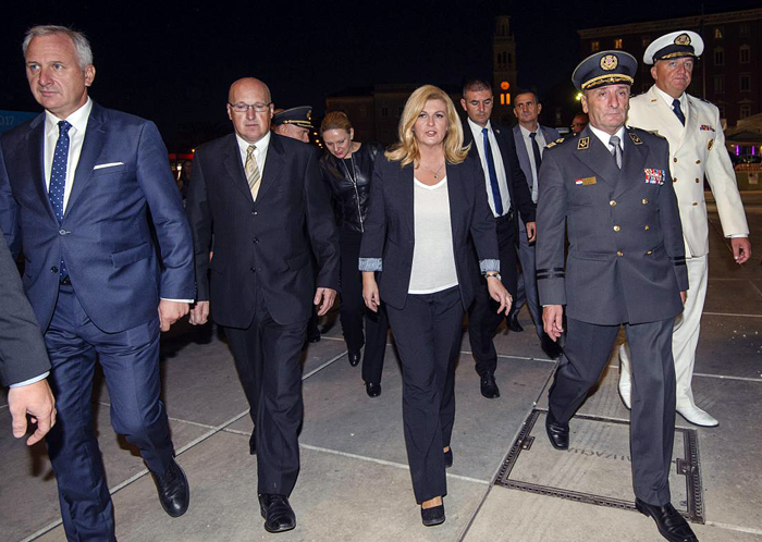 Predsjednica je u Split stigla nešto prije 20 sati, a pred crkvom sv. Frane, na početku Rive dočekao je gradonačelnik Andro Krstulović Opara te se s njim i u pratnji svojih suradnika uputila preko glavne gradske šetnice do restorana "Adriana", odakle je u društvu visokih vojnih dužnosnika na čelu s generalom Mirkom Šundovom, zapovjednikom glavnog Stožera oružanih snaga RH i atašea pratila prigodni program.