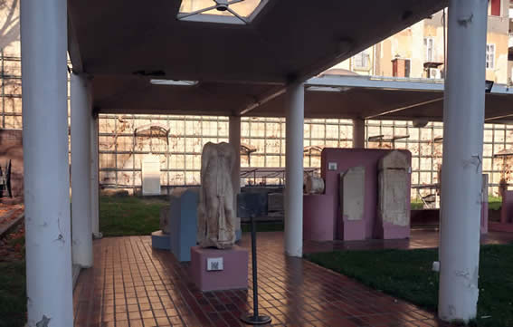 Širi izbor rimske kamene spomeničke građe, sistematiziran u nekoliko tematskih cjelina, izložen je manjim dijelom u prizemlju muzejske zgrade, a većim dijelom na prostoru dvorišta-vrta Muzeja, pod trijemom i u slobodnom prostoru, vjerojatno poradi velikih dimenzija i težine. Izloženi su odabrani kameni spomenici - miljokazi, počasni natpisi, monumentalne statue, žrtvenici, nadgrobne stele, sarkofazi itd.