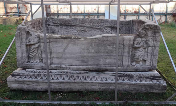 Ulomak poklopca sarkofaga, mramor, Srijemska Mitrovica, 3. st. i sarkofag