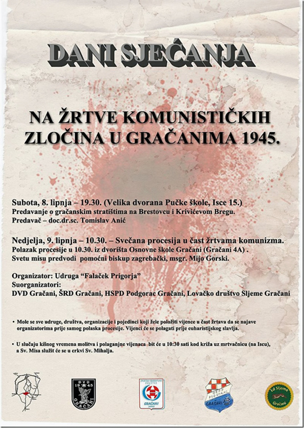 Udruga "Falaček Prigorja" organizira u subotu 8. lipnja i nedjelju, 9. lipnja "Dane sjećanja na žrtve komunističkih zločina u Gračanima 1945.