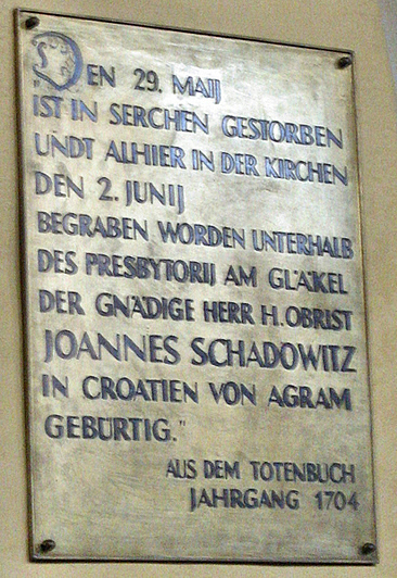 "Dana 29. svibnja u Serhenu je preminuo i ovdje u crkvi 2. lipnja pokopan ispod prezbitorija u Glaekelu milostivi g. pukovnik Johanes Schadowitz u Hrvatskoj rođen u Zagrebu. Iz knjige mrtvih godine 1704."