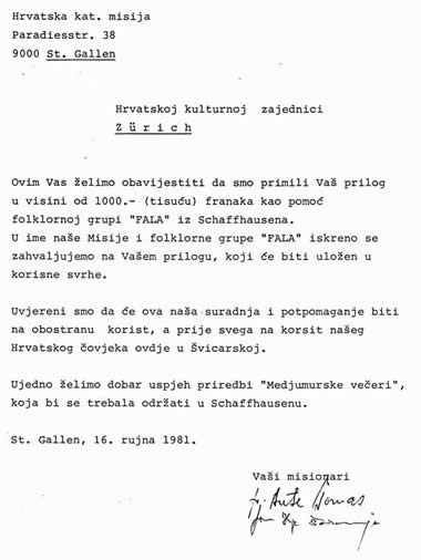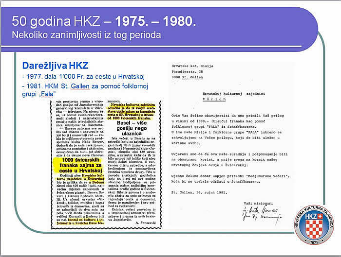 Dobrovoljnu pomoć HKZ daje NK Croatia u Zuerichu za 10. rođendan i Hrvatskoj katoličkoj misiji za folklornu grupu "Fala". |