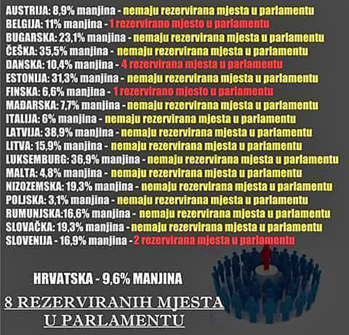Kako je pitanje zastupljenosti predstavnika nacionalnih manjina riješeno u članicama Europske unije? Model sličan Hrvatskoj ima Slovenija, čiji se zastupnici talijanske i mađarske nacionalne manjine biraju također relativnom većinom u posebnim jedinicama. Slovenija je, dakle, uz Hrvatsku jedina zemlja Europske unije gdje postoje manjinski zastupnici. Međutim, to se odnosi samo na Talijane i Mađare, koji se smatraju autohtonim nacionalnim manjinama. Građani doseljeni iz drugih republika bivše države koji čine 20 posto stanovništva nisu priznati kao manjine jer se smatraju ekonomskim emigrantima.