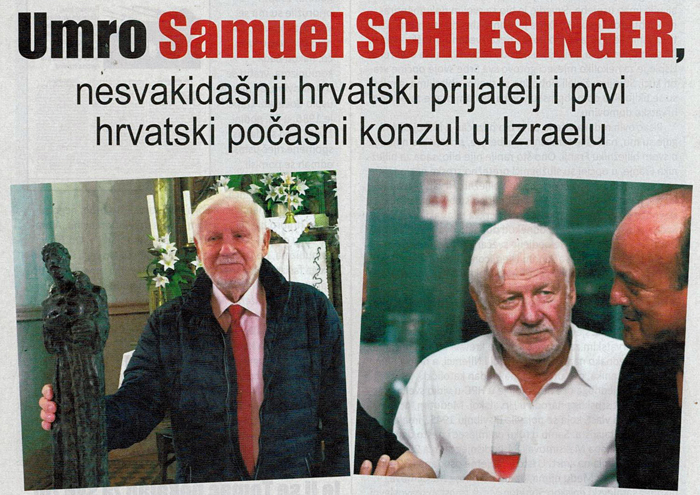 S njim i njegovima ispraćao sam stare i dočekivao neke Nove godine u Tel Avivu, zajedno smo ljetovali, putovali, gledali kazališne predstave u Izraelu i Hrvatskoj. Njegova kuća uvijek je bila otvorena za svakoga tko je došao iz Hrvatske. Sluteći da je kraj blizu, zamolio me da mu donesem grumen hrvatske zemlje iz Like. Obećanje sam, naravno, ispunio. S tim grumenom zemlje rodne mu grude otputovao je Samuel Schlesinger u vječnost. Otišao je čovjek velikoga srca koje je kucalo za mnoge koji su bili u nevolji, ali posebno toplo i nježno kucalo je za Hrvatsku. Neka mu je vječna hvala za sve što je napravio da bi istina o Lijepoj Našoj postala dio realnosti u Izraelu.
