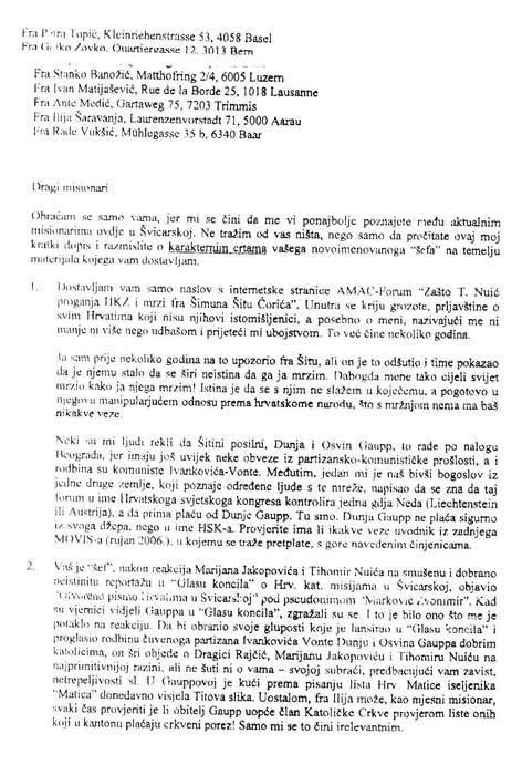 2. VaÅ¡ je "Å¡ef’’, nakon reakcija Marijana Jakopovića i Tihomir Niuića na smuÅ¡enu i dobrano neistinitu reportažu u “Glasu koncila†o Hrv. kat. misijama u Å vicarskoj, objavio "otvoreno pismo Hrvatima u Å vicarsoj" pod pseudonimom ‘MarkoviÄ Zvonimir'. Kad su vjernici vidjeli Gauppa u "Glasu koncilaâ€, zgražali su se i to je bilo ono Å¡to me je potaklo na reakciju. Da bi obranio svoje gluposti koje je lansirao u "Glasu koncila†i proglasio rodbinu Äuvenoga partizana Ivankovića Vonte Dunju i Osvina Gauppa dobrim katolicima, on Å¡iri objede o Dragici RajÄić, Marijanu Jakopoviću i Tihomiru Nuiću na najprimitivnijoj razini, ali ne Å¡uti ni o vama -- svojoj subraći, predbacujući vam zavist, netrpeljivost i sl. U Gauppovoj je kući prema pisanju lista Hrv Matice iseljenika "Matica"' donedavno visjela Titova slika. Uostalom, fra Ilija može, kao mjesni misionar, svaki Äas provjeriti je li obitelj Gaupp uopće ÄŒlan KatoliÄke Crkve provjerom liste onih koji u kantonu plaćaju crkveni porez! Samo mi se to Äini irelevantnim.