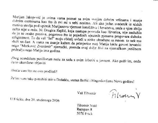 Dakle, kako nemam veze ni s tim od njega poslanim materijalima niti sam pisao to pismo pod imenom „Marković Zvonimir“, to pisanje toga godinama od neobjaÅ¡njivog bijesa na mene zapjenjenog kolege Tihomira - s gaÄ‘enjem odbacujem kao najružnije laži i klevete. Ta znate, ovo mu nije prvi put da me podlo kleveće! Osveta ne može biti, neÅ¡to je tu drugo, jer ni njemu, ni njegovoj supruzi s kojom sam bio vrlo dobar prijatelj sa studija i poslije njega, ni njegovima - nikada niÅ¡ta loÅ¡e nisam uÄinio!