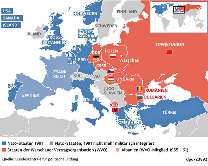 Rus dopušta ukidanje demarkacijske linije između Istočne i Zapadne Njemačke i raspušta "Varšavski pakt", povlači svoje trupe iz istočne Europe i vjeruje u usmeno obećanje Hans-Dietricha Genschera (bivšeg vicekancelara SR Njemačke i James Baker (bivši ministar vanjskih poslova SAD-a) u veljači 1990. da se bivše članice "Varšavskog pakta" neće pridružiti NATO-u. "Nema širenja NATO-a na istok".