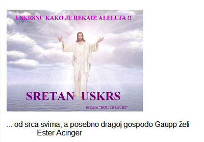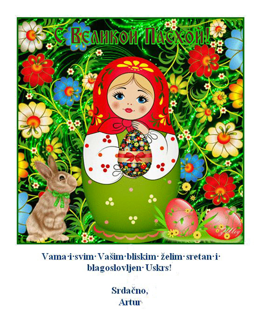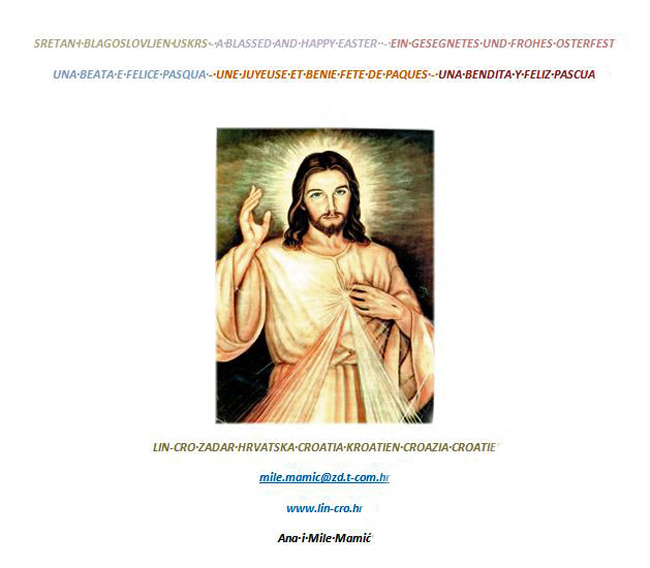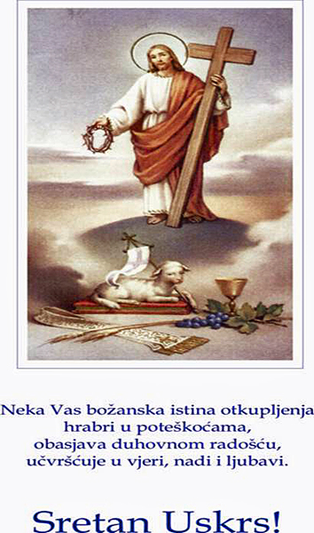 Vama također od sveg srca Sretan Uskrs, a isto tako i vašim obiteljima, sa željama da vas božja Providnost sve zajedno čuva i brine o vašem i duhu i tjelu, pa neka za ove izuzetne dane spomena na Kristove puteševstije i Uskrsnuće svima vama donese sreću i znakovlje ljubavi u ovim prigodama i duhovnim događanjima i obnovama.