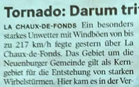 Područje oko opčine Neuchâtel smatra se ključnim područjem razvoja jakih uragana. Razorna tornada su se ovdje dogodila nekoliko puta u prošlosti. Na primjer, 12. lipnja 1926. uragan je bjesnio u blizini La Chaux-de-Fonds.